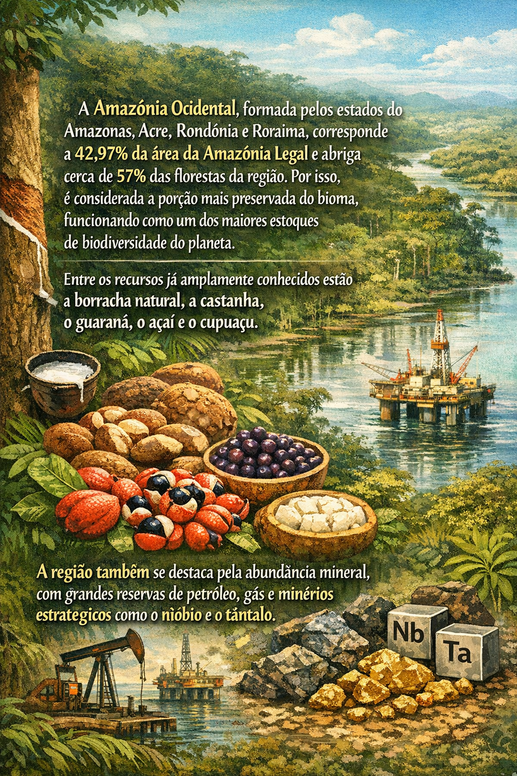 A Amazônia Ocidental, formada pelos estados do Amazonas, Acre, Rondônia e Roraima, corresponde a 42,97% da área da Amazônia Legal e abriga cerca de 57% das florestas da região. Por isso, é considerada a porção mais preservada do bioma, funcionando como um dos maiores estoques de biodiversidade do planeta. Entre os recursos já amplamente conhecidos estão a borracha natural, a castanha, o guaraná, o açaí e o cupuaçu. A região também se destaca pela abundância mineral, com grandes reservas de petróleo, gás e minérios estratégicos como o nióbio e o tântalo.