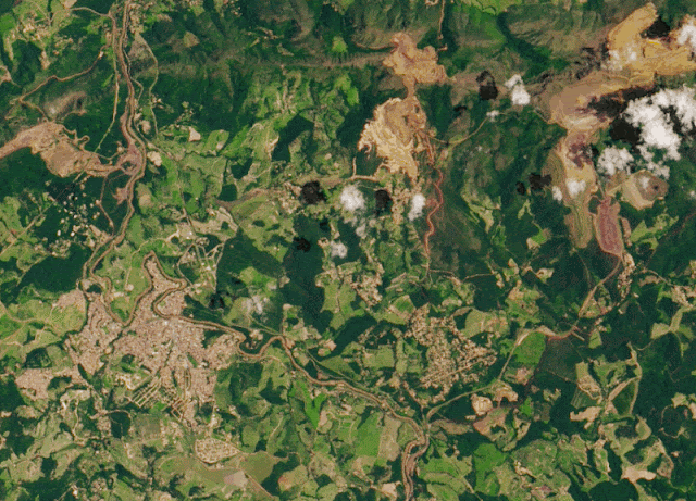 • Áreas afetadas: Manchas escuras alongadas mostram o avanço da lama rio abaixo, com tons terrosos em depósitos e erosão visível nas margens. [obt.inpe]​
