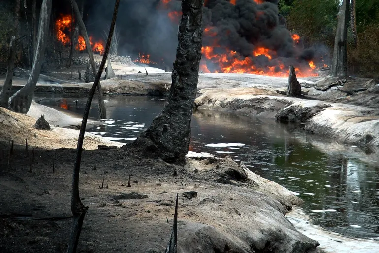 Imagem: Oil from a leaking pipeline burns in Goi-Bodo, a swamp area of the Niger Delta in Nigeria October 12, 2004 [Austin Ekeinde/Reuters]. Disponível em: https://www.aljazeera.com/features/2022/12/21/timeline-oil-spills-in-nigerias-ogoniland.